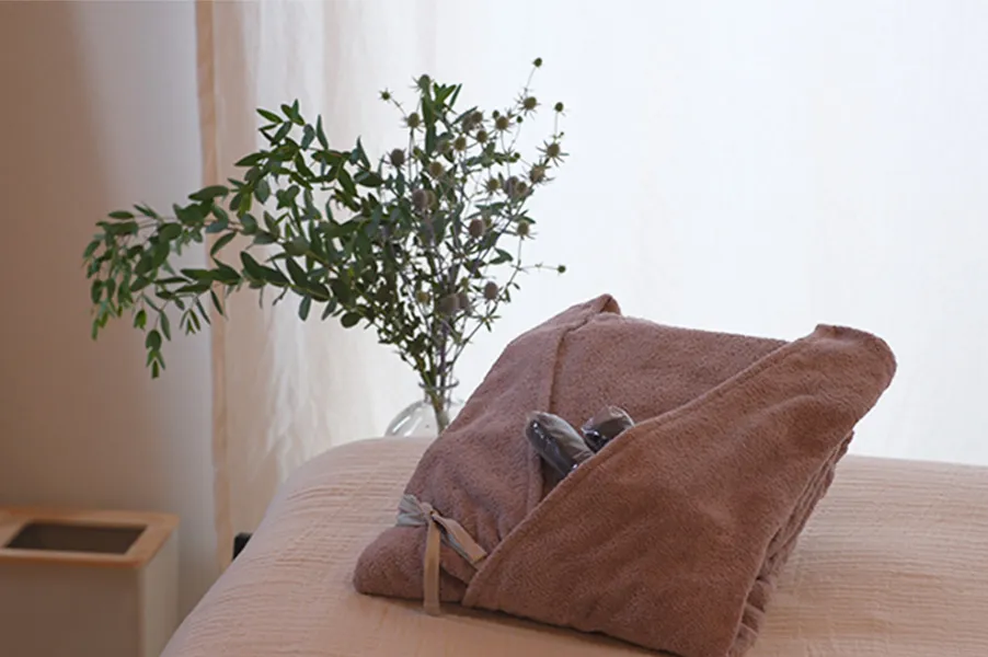 施術が終わりましたらホットタオルをお渡しします。 お着替え、身支度をお願いします。 コームなどご自由にお使いください。